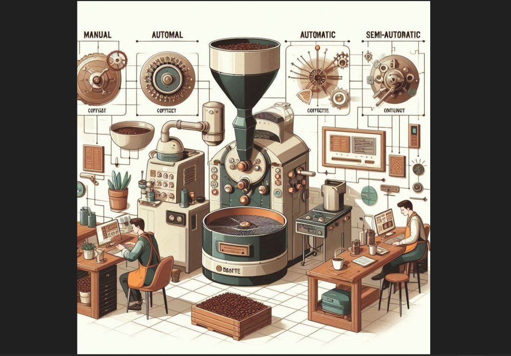 • Processes such as discharging green coffee into the drum, unloading roasted coffee from the drum, and discharging cooled coffee from the mixer are automatically performed using pneumatic pistons or motors. Durations and conditions may vary depending on the machine manufacturer or user.